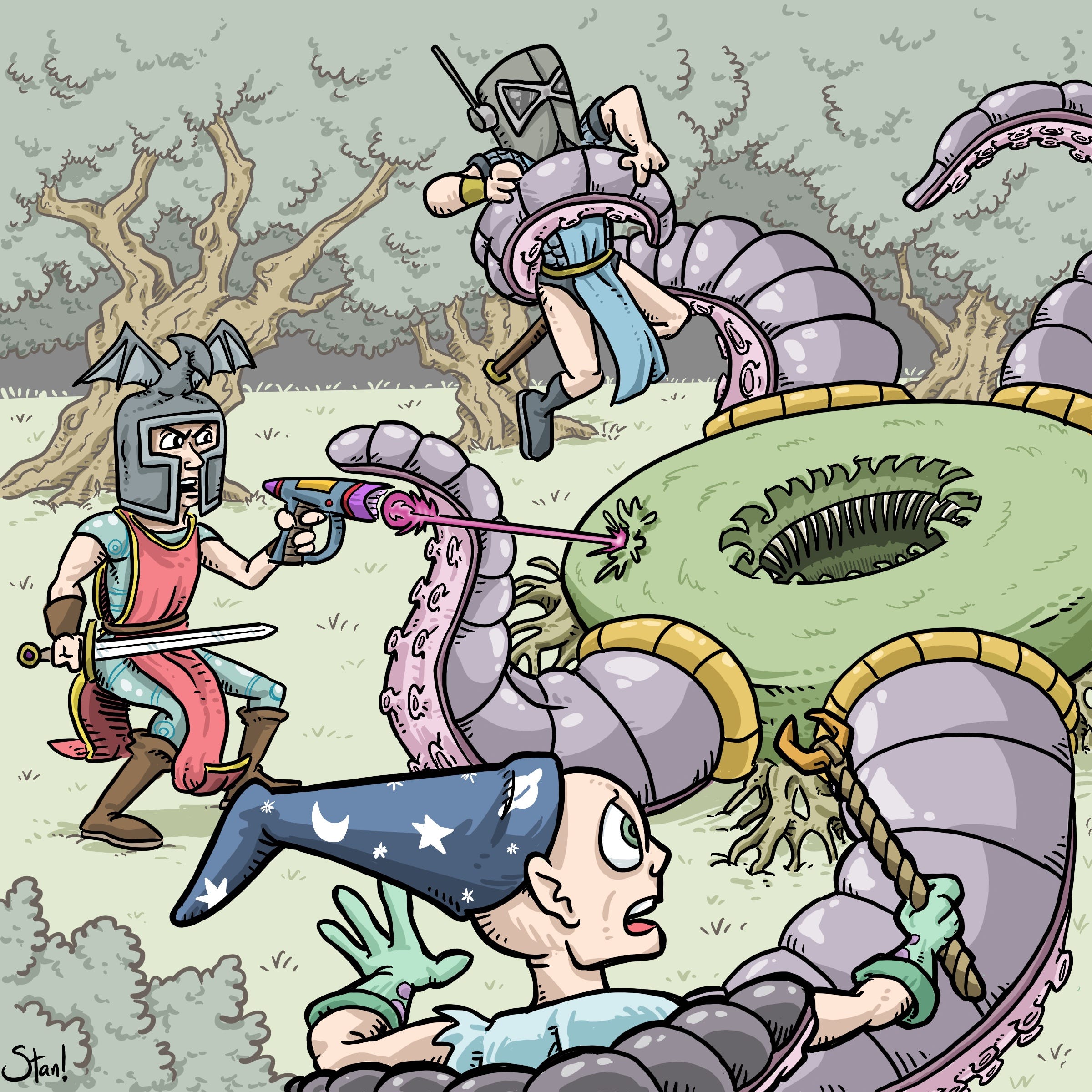 An adventuring party with a blaster and sci-fi armor … who could turn up the chance to draw that?!? I tweaked the color scheme a little, and made a few minor adjustments … but I think I captured the wa-hoo craziness of the original. (I hope Erol thinks so, too.)