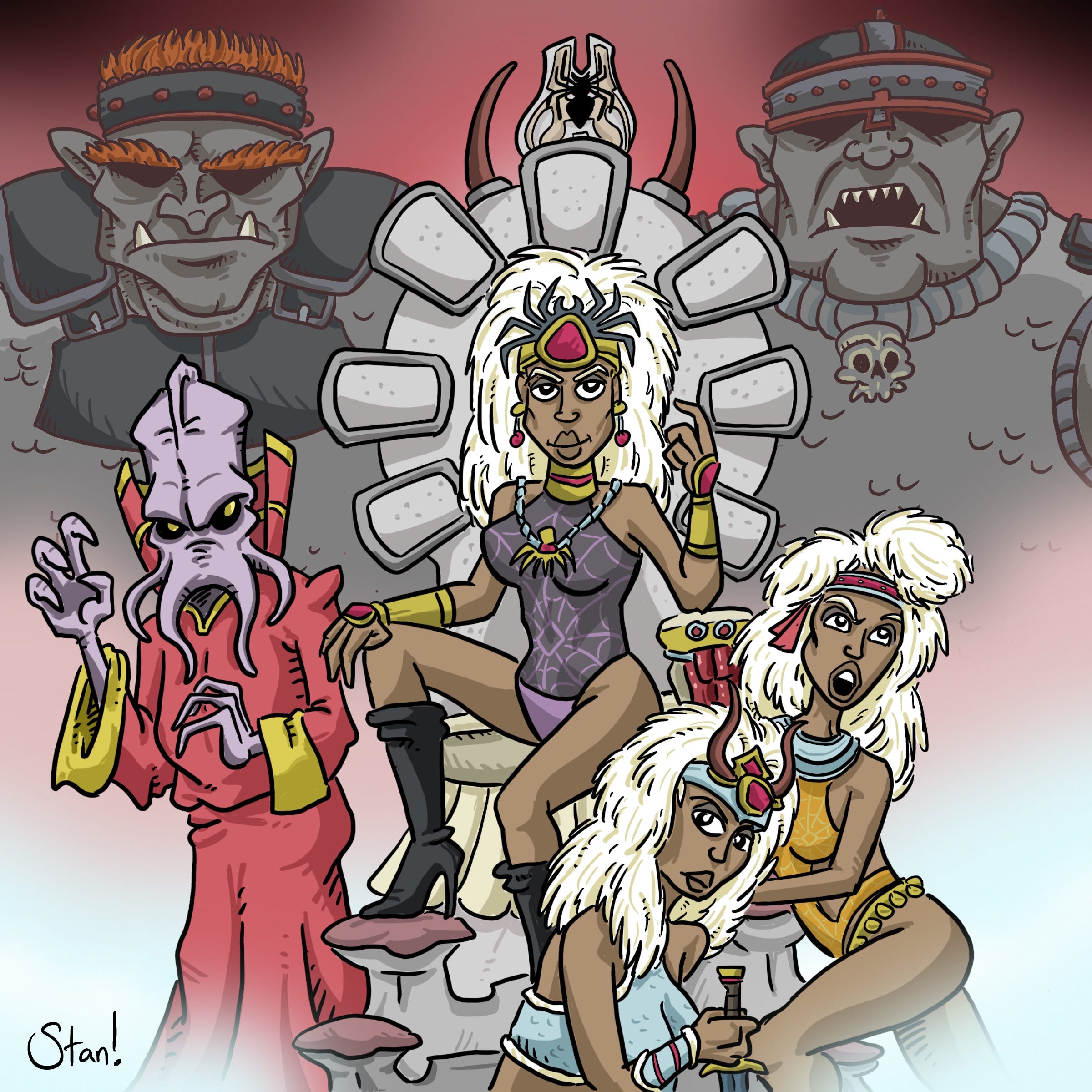 While chatting with David “Zeb” Cook during episode 14, I worked on a cartoon homage to the cover of Queen of the Spiders, a 1986 collection of adventures that compiles the “Giants” series, the “Drow” series, and Queen of the Demonweb Pits into a single 152-page book.