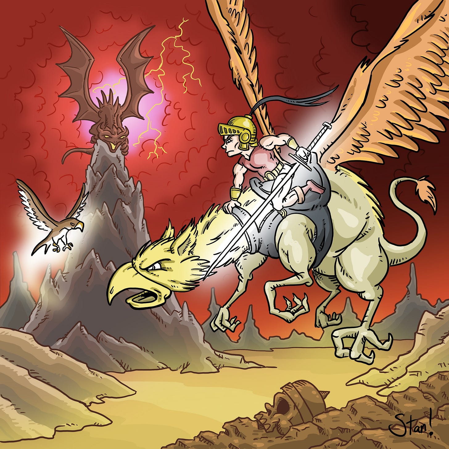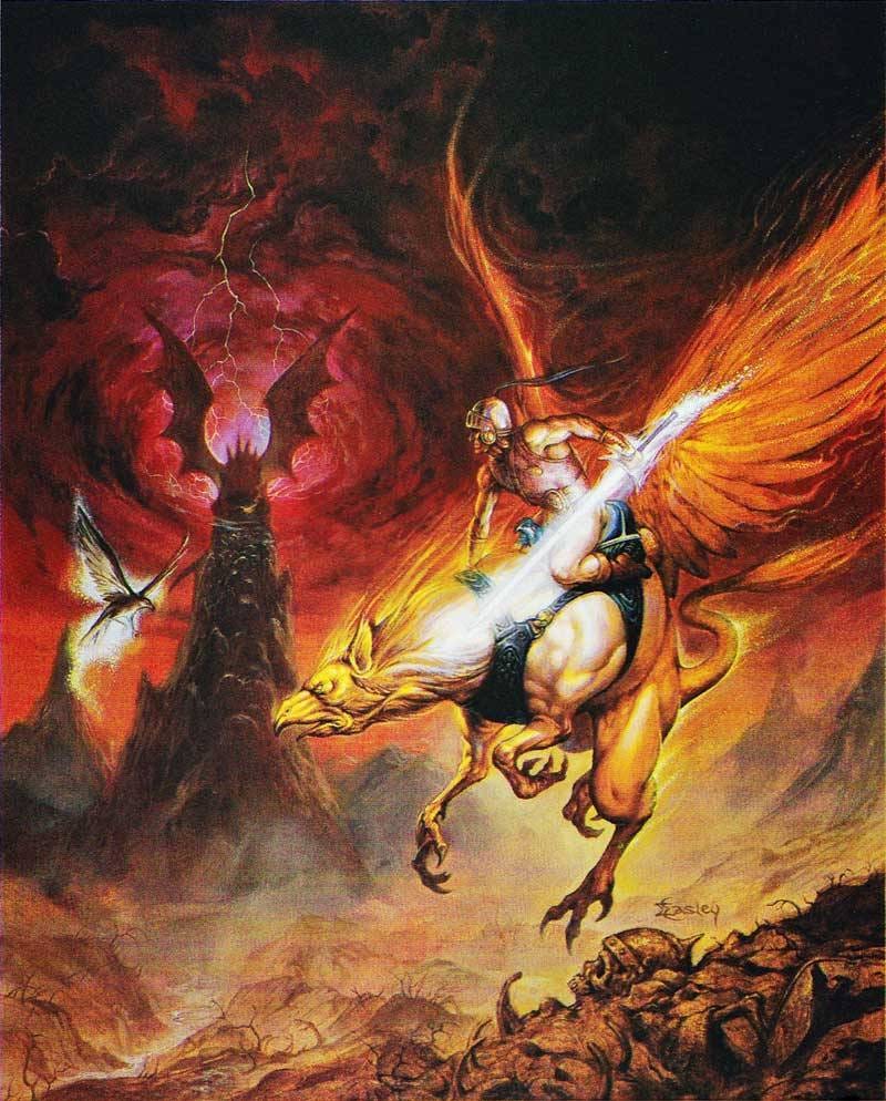 What’s more, when I found a file of image as it appears in the prints that Jeff sold, it became clear that some color shifting was done for the book cover. The sky is red, rather than purple, and more of the blasted landscape is visible. The creature on the mountain now seems more clearly draconic, and the warrior’s glowing sword shines with a brighter, purer light. The griffin itself has more of a fiery, almost elemental motif.