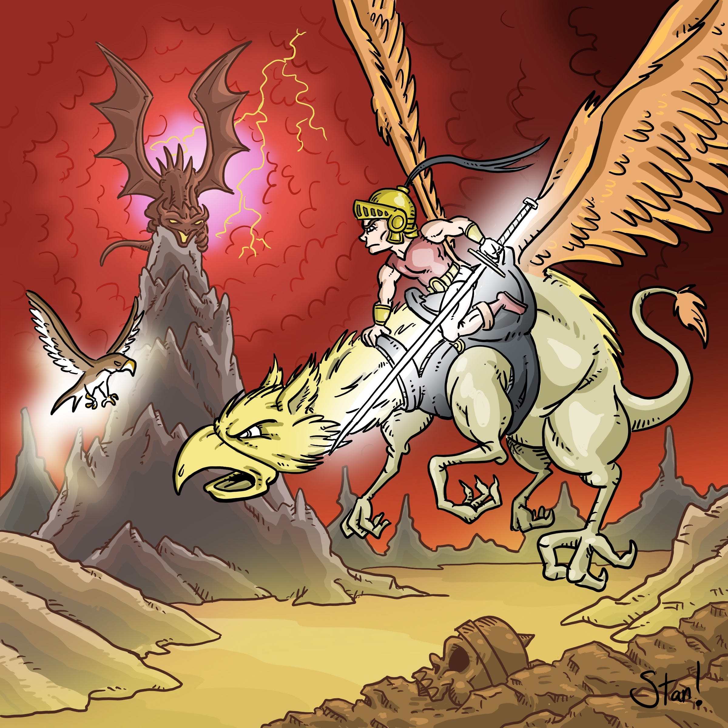 While talking with Matt Forbeck during episode 15, I began work on a cartoon homage to the classic Greyhawk Adventures hardcover—another one by the great JEff Easley. I’ve always found this image to be as mysterious as it is thrilling. A warrior riding a griffin over a mist-shrouded wasteland, while some kind of bat-winged creature lurked menacingly on a mountain peak in the background. But like so many of Jeff’s paintings, the closer I looked at it, the more I found.
