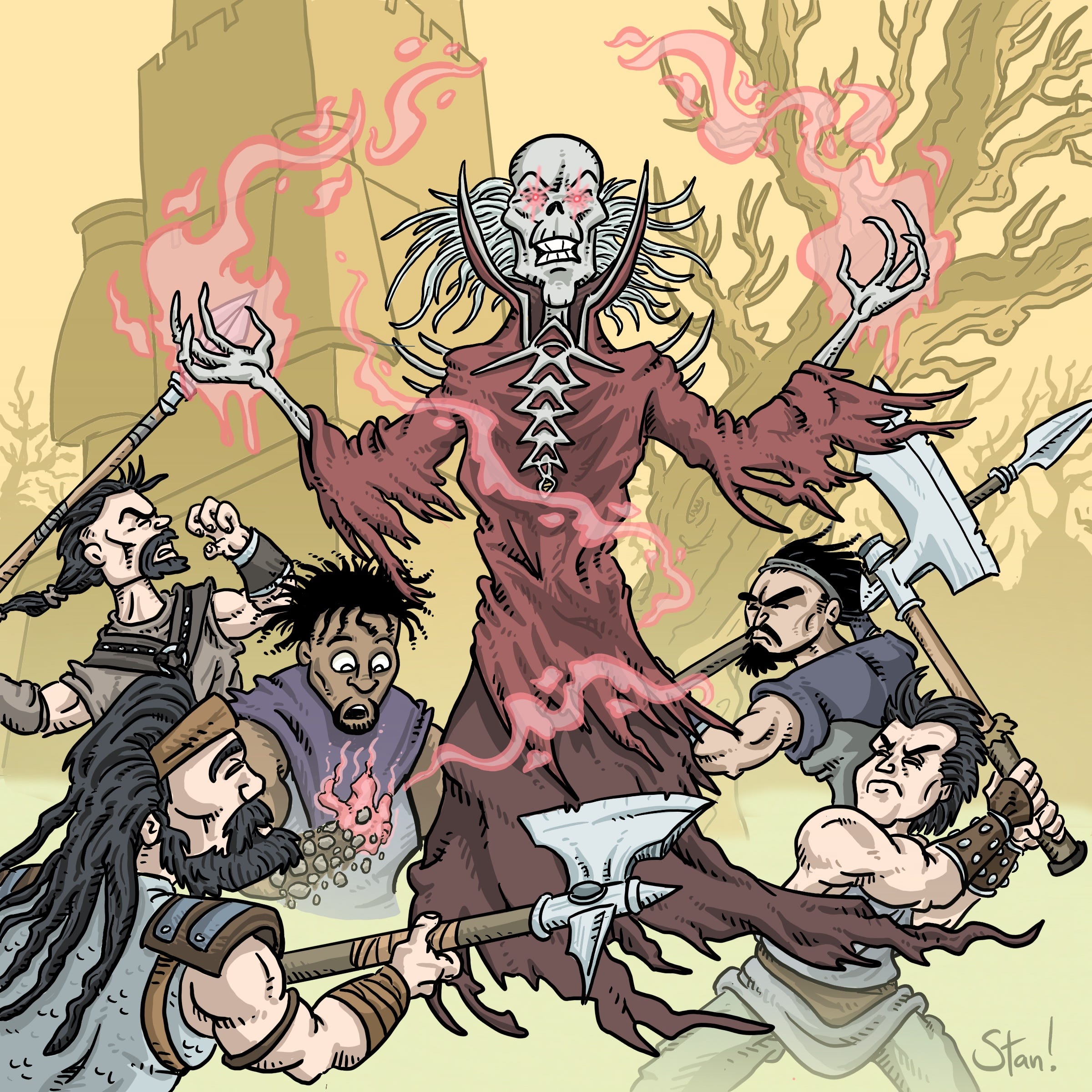 In this case, Matt Wilson give us a scene of a ghastly undead creature being assaulted by eight warriors (plus trio of spellcaster and seven more warriors on the back cover). I picked my favorites of the attackers for my greatly condensed homage … but I could easily have chosen others, or brought in the spellcasters instead. Check out the whole image if you get the chance … it’s a real corker!