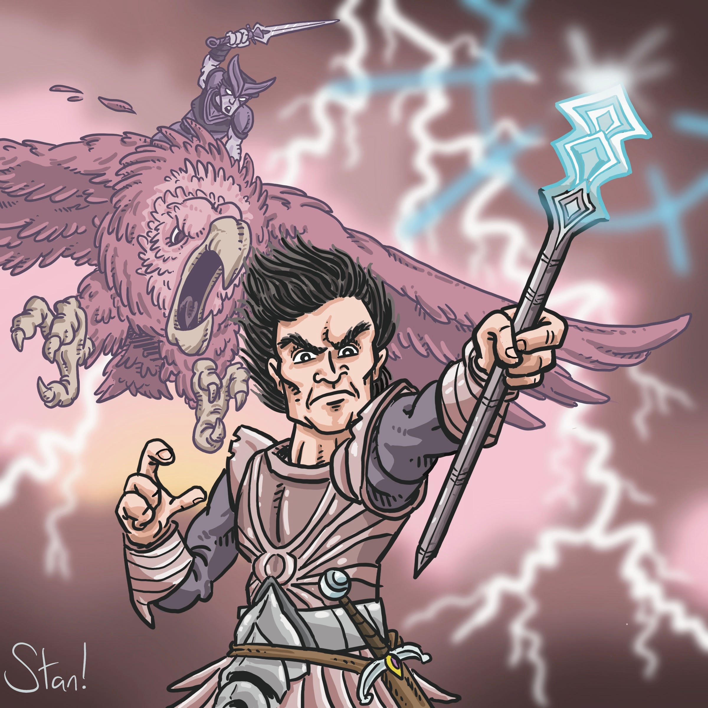 Raymond Swanland’s cover image is moody and powerful … and it wasn’t until I started thinking about drawing an homage to it that I realized that I wasn’t REALLY clear on what was actually going on in it. (Kind of like I felt when doing my homage to the 1988 Greyhawk Adventures cover.) Is that guy an evil lord urging his minions on to attack his enemies? Or is he a heroic spellcaster about to be attacked from behind by a giant-eagle-riding enemy? And does it really matter? It’s still a super cool image!